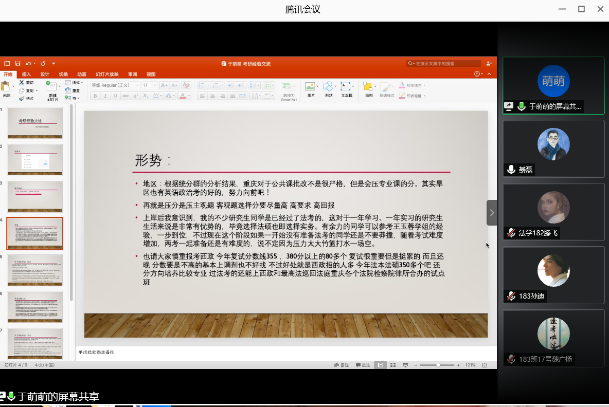 为进一步激发法学专业学生的考研热情,明确考研目标、掌握考研技巧,法律系于6月29日通过线上方式召开“2020年度考研经验交流会”。考取名校硕士研究生的16级法学专业学生、2017级至2019级法学专业学生参加了交流会。交流会由法律系主任綦磊老师主持。
