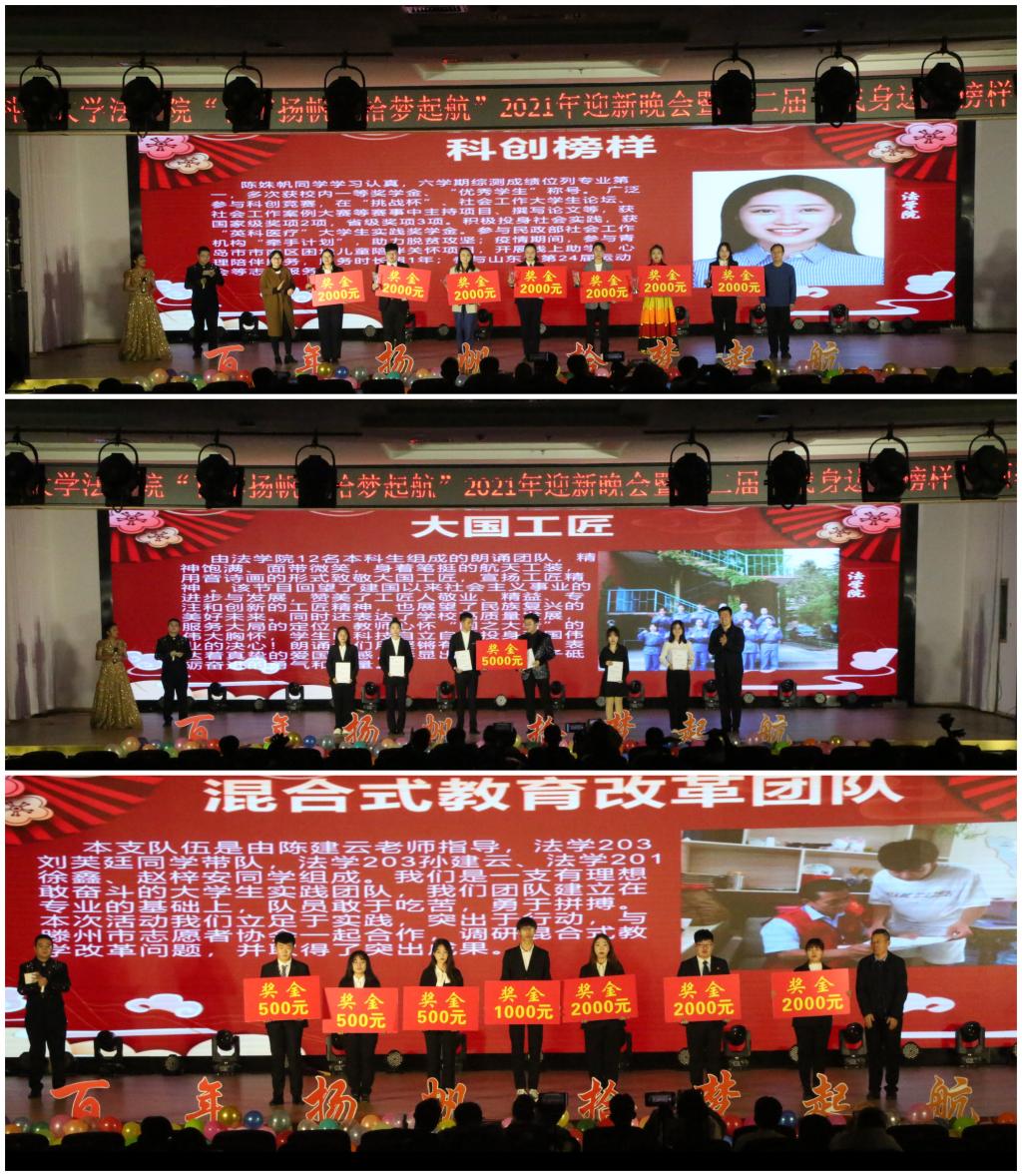 为选树典型,发挥榜样引领,9999js金沙老品牌开展了第二届“我身边的榜样”评选活动。晚会现场,王金堂和李卉为第二届“我身边的榜样”获奖人员颁发奖杯和奖金;陈兵为《大国工匠》表演团队颁发证书;陈为智为2021暑期“三下乡”社会实践优秀团队颁奖,为研究生建档立卡助学金获得者发放助学金,表彰他们的优异表现,也让同学们感受到了榜样的力量。