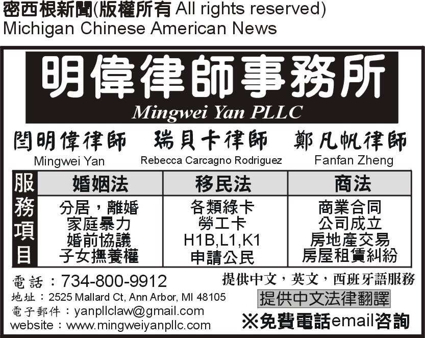 自主创业以后,她成立的明伟律师事务所主营民事诉讼(civil litigation)、移民(immigration)、财产规划(estate planning)等业务,还代理芝加哥领事馆辖区内的三级认证业务,是目前密西根最大的华人律所之一。作为美国信托律师,她曾经接受过国内《法治周末》等媒体的采访。
