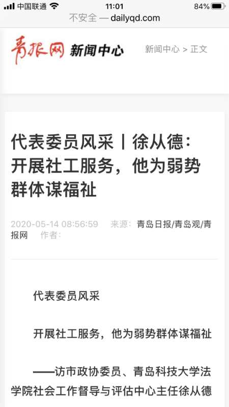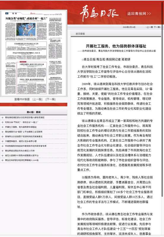 2009年,徐从德来到青岛科技大学任教并参与创办社会工作系,同时继续开展社工服务。他立足青岛实际,以“尊重、接纳、关爱、使能”的社会工作专业价值理念,在社会工作政策推进、专业服务、督导培训、机构管理、理论研究等领域开拓进取,积极服务社会弱势群体,传递社会工作专业理念,为推动青岛社会工作的专业化和职业化建设做出了积极的贡献。