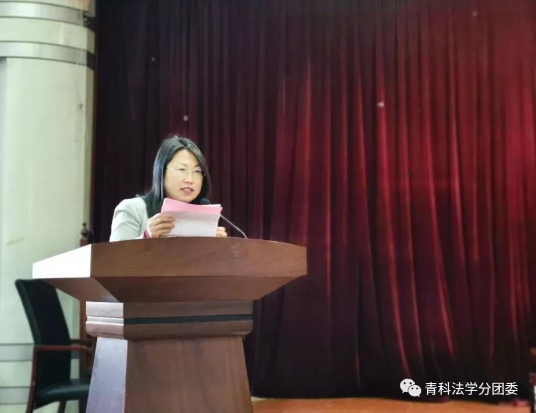优秀本科生导师代表金英爱老师发言,金老师表示,学院本科生导师制度开创学校的先河,在育人、科研、实践等方面有巨大的优势。导师要做新时代法社人的引路人,要与学生共同发展、共同进步,表达了对全体新生的鼓励与期待。