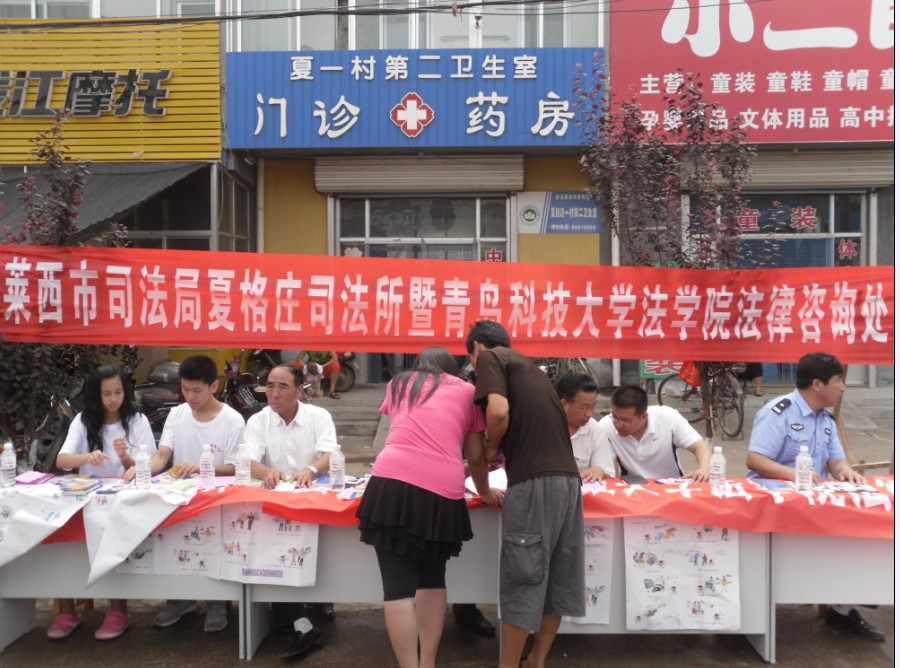 服务团在一周的时间内,展开了紧凑而充实的普法宣传实践活动。与莱西市司法局、夏各庄镇司法所以及夏各庄镇派出所联合开展了“普法大集”活动,在“普法大集”上,服务团发放普法材料上千份,针对老百姓所急需的法律知识,如有关农村宅基地转让与买卖、农村赡养老人等法律问题进行了现场宣讲,并且对两起有关农村宅基地和店面租赁所发生的纠纷给予满意的解答;与夏各庄镇司法所一起深入到夏各庄镇的夏一、夏二、宫家城、杜家疃等4个村庄调研社会稳定和矛盾纠纷化解调处及新农村建设等工作;到镇派出所进行业务学习和沟通;到夏格庄法庭现场观摩人民法庭开庭审理案件全程并协助法庭成功参与调解了一起继承纠纷案件;与全国优秀人民调解员——夏各庄镇司法所张伟伟所长进行了座谈,就纠纷矛盾解决的“细化处理”和矛盾解决后继续追踪从而彻底化解矛盾的纠纷解决方法(ADR)进行了深入的探讨;7月20日上午,成功调处了大宅科村一起赡养老人纠纷,双方当事人对调解结果都非常满意。