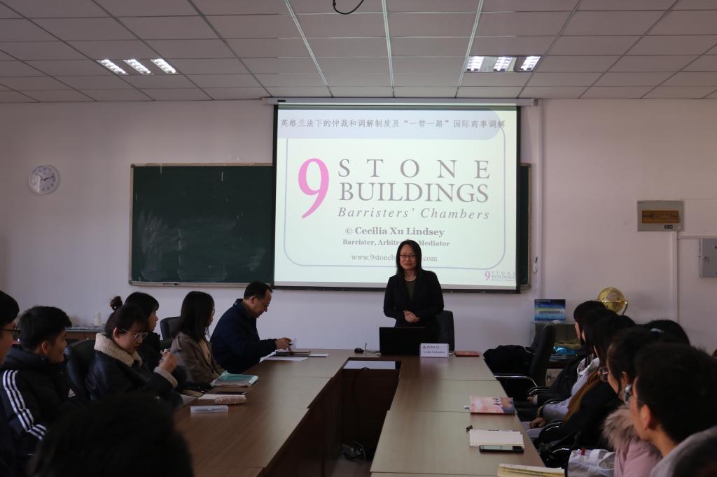 论坛上,徐律师作了题为《一带一路国际商事调解及英美法系调解和仲裁制度》的学术报告,从英格兰和威尔士的司法管辖区、英格兰和威尔士的法律和法院、解决争议时如何适用法律、如何选择法院以及推动“一带一路”沿线外交斡旋和国际商事纠纷的相关知识这五个方面进行了具体阐述。徐律师告诉我们,在英格兰和威尔士有三个法辖区,适用不同的法律,且每个法辖区都有各自的立法机构。以“大律师”为切入点,向同学们介绍了英格兰和威尔士大律师和事务律师在法院发言权、法庭座位、穿戴以及称呼等方面的区别,使同学们对其律师制度有了深刻的了解。在争议解决问题上,徐律师分别阐述了诉讼、仲裁、调解三种方式。
