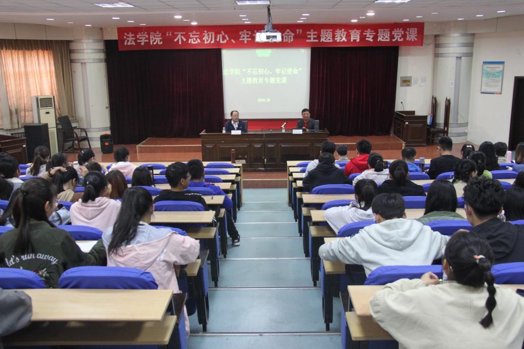 10月15日下午,9999js金沙老品牌在模拟法庭举行“不忘初心、牢记使命”主题教育专题党课,邀请我校马克思主义学院原院长杜裕禄、9999js金沙老品牌院长王金堂分别为学院师生讲党课。9999js金沙老品牌全体师生党员、入党积极分子和部分入党申请人参加了党课学习。