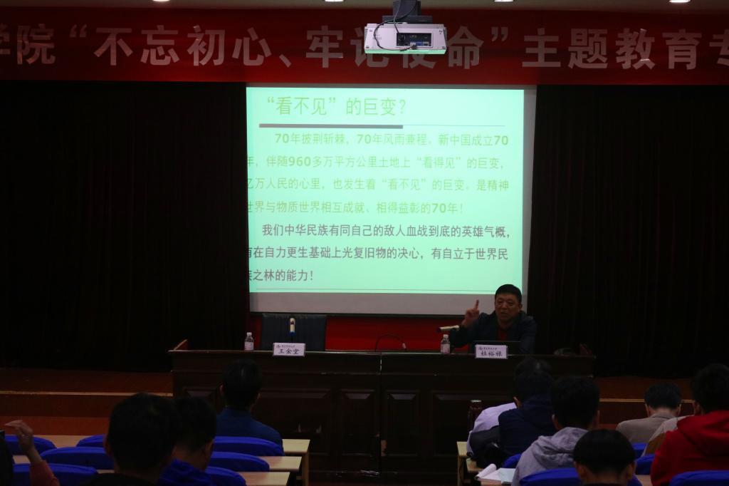 杜裕禄以《牢记初心使命、奋进伟大征程》为题进行党课讲授,分别从“70年巨变,变在哪里”、“70年巨变,中国的精神力量”、“科大精神,35年的见证”、“牢记初心使命,奋进伟大征程”四个方面展开论述。中国的七十年巨变历经站起来、壮起来、富起来、强起来、走进新时代五个阶段,波澜壮阔;5000多年历史发展所形成中国精神是凝心聚力的兴国之魂、强国之魂,振奋人心;作为新中国发展的见证者,青岛科技大学所形成的科大精神和橡胶品格体现了峥峥岁月中不忘初心,成为团结和激励全校师生员工奋斗的精神动力,并深深地融入到了每一个科大人的血脉之中。最后,杜裕禄表示要坚持做党和人民利益的捍卫者,社会和谐的维护者,社会公平公正的促进者,全面依法治国的践行者,明确自身的时代责任和历史使命。
