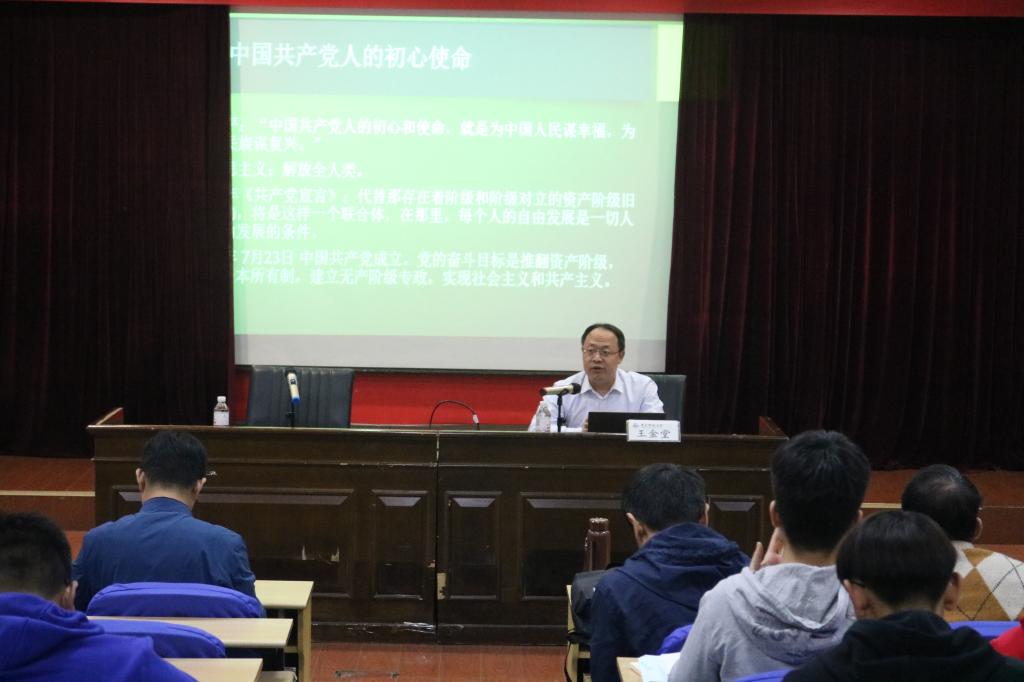 王金堂以《牢记初心使命,坚定道路自信,做中华民族伟大复兴事业的实干家》为题开展专题党课。王金堂从马克思主义的产生到马克思主义中国化的进程讲起,诠释了中国共产党人的初心和使命,就是为中国人民谋幸福,为中华民族谋复兴。王金堂从中国共产党的理论先进性和传承性等方面讲解了中国共产党领导的理论优势,从发展策略的系统性和党内组织的执行力等方面讲解了中国共产党领导的实践优势。最后,王金堂要求广大师生党员自觉以习近平新时代中国特色社会主义思想为指导,立足岗位做好教书育人和学科建设工作,亮明身份发挥先锋模范带头作用,争做做中华民族伟大复兴事业的实干家。