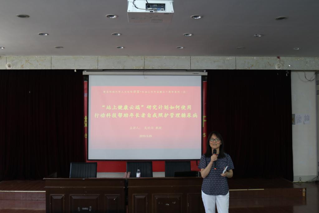 第二场讲座,美国南加州大学社会工作学院吴欣怡教授带来《站上健康云端研究计划——如何使用行动科技帮助年长者自我照护管理糖尿病》的专题讲座。首先,吴教授简要讲解了糖尿病的病理知识与对人体所造成的不良影响,并用数据展示了目前糖尿病患者在中国以及美国的数量情况,强调了该研究的紧迫性。接着,吴欣怡教授用详细的数据,详细介绍了该项目的志工招募,项目的运作,研究的开展,服务效果的评估等各项环节的情况。指出:目前以平板电脑为代表的移动科技的使用可以有效缓解老年人的糖尿病、高血压等慢性病症状,并且大学生与老年人在移动科技使用上的交流与互动,将有效缓解世代隔阂,促进老年友好型社会、健康型社会建设。