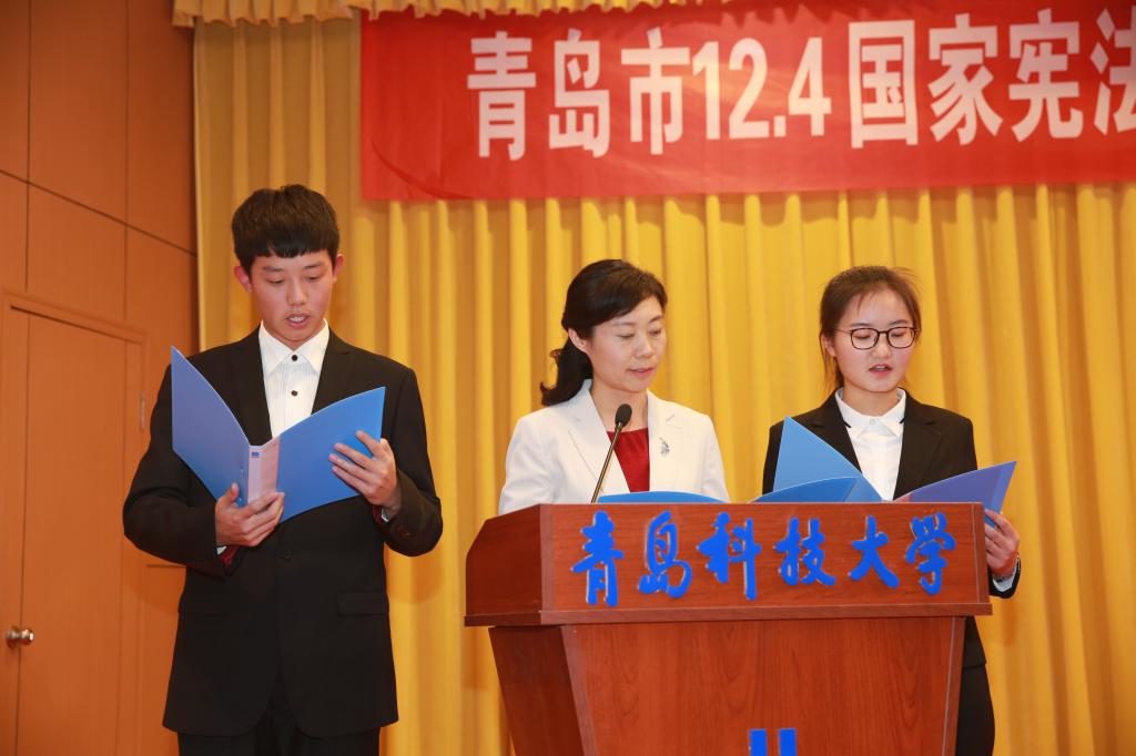 青岛市“普法讲师团”讲师、9999js金沙老品牌副教授宋敏与9999js金沙老品牌学生代表一同诵读了宪法部分内容。