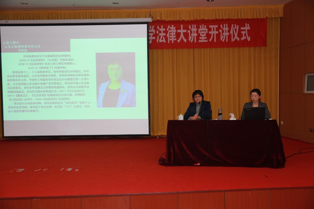 集中宣传活动后,青岛科技大学法律大讲堂正式开讲。中央电视台《社会与法》栏目主讲人、崂山区政协委员、青岛市律师协会常务理事李秋航为现场师生做了一场“2018国家宪法日”专题普法讲座。