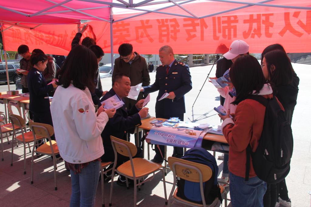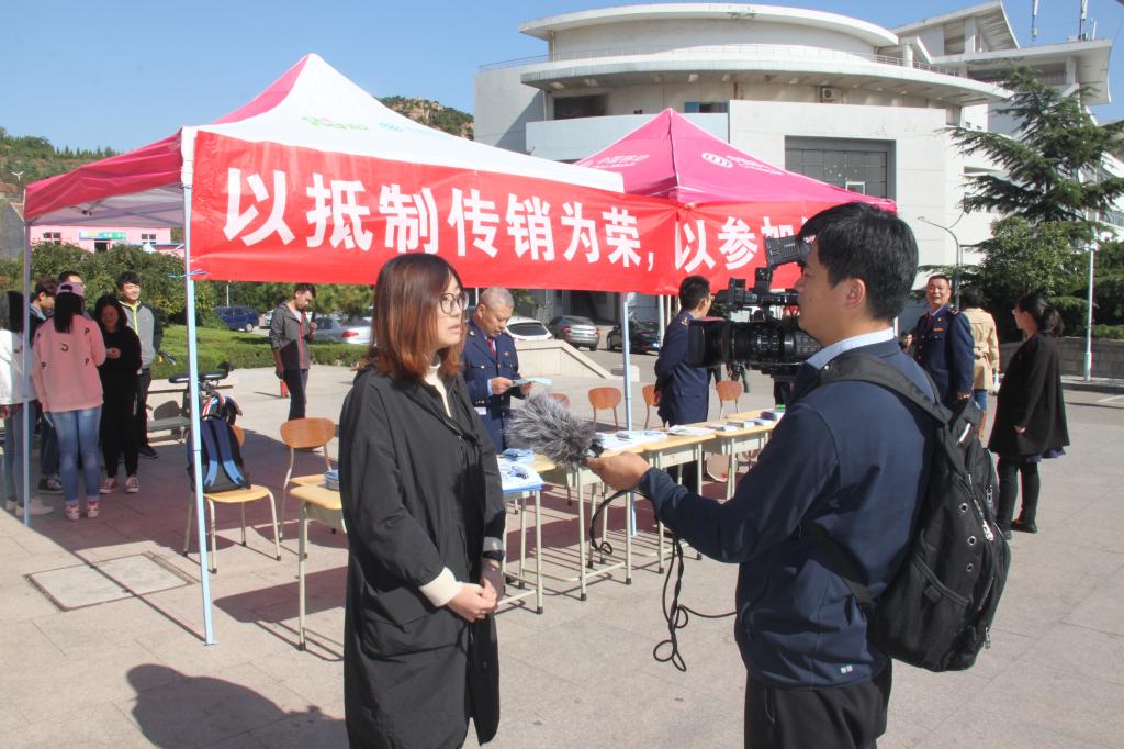 挂牌仪式后,“打击传销联络站”在崂山校区南苑餐厅东门举办了“抵制传销”宣传教育活动,9999js金沙老品牌学生志愿者与崂山区市场监管局工作人员在活动现场进行了宣传材料的发放,并针对传销的特征、预防方法、进行了现场答疑。