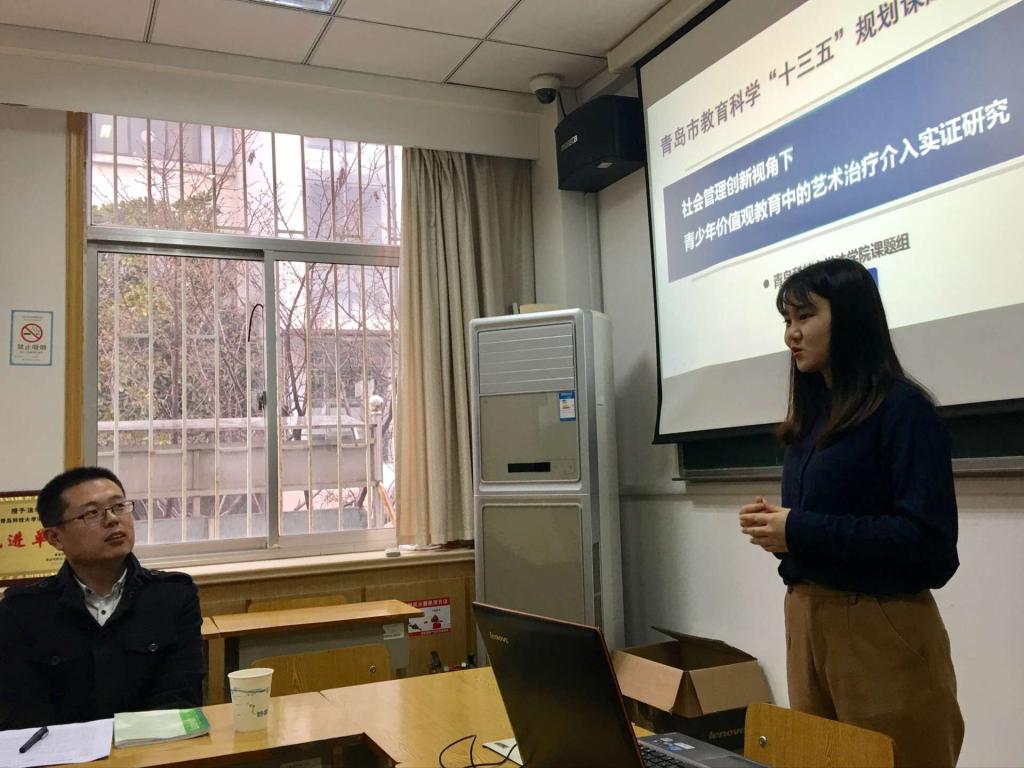 在汇报交流中,金英爱老师结合自身最新研究方向,提出:艺术治疗由于其投射性和不言的优势, 可使青少年在受到充分尊重的氛围中,外显并修正自身观念与行为存在的问题。将艺术治疗原理运用于学校青少年思想政治教育情境下,将艺术治疗引入培育青少年价值观实践,帮助价值观缺失青少年端正认知、纠正行为,并为青少年教育方式方法创新提供参考。