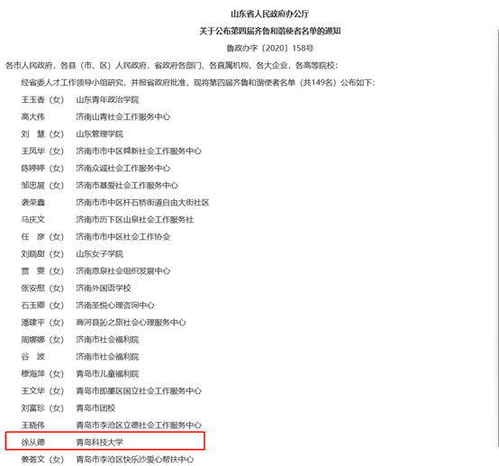 近日,山东省“齐鲁和谐使者”选拔管理工作办公室组织评选出第四届“齐鲁和谐使者”,我院社会工作系徐从德副教授成功入选。