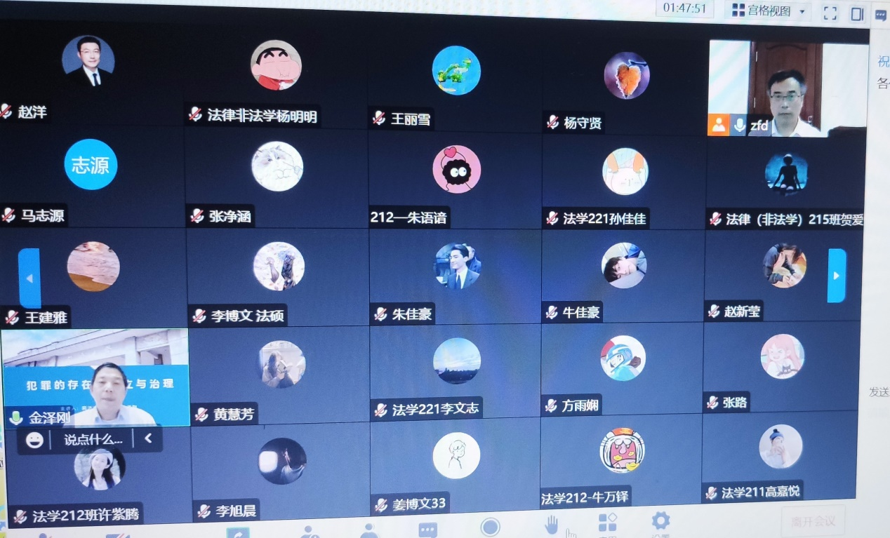 2022年11月11日晚,曾任上海市第一中级人民法院法官,现任中国刑法学研究会理事、上海德禾翰通律师事务所刑案研究院院长(兼职律师)、同济大学刑事法研究中心主任、博士生导师金泽刚教授,受邀为9999js金沙老品牌广大师生做了题为《犯罪的存在、成立与治理》的精彩报告。报告会由9999js金沙老品牌张福德教授主持,9999js金沙老品牌赵洋等教师及学生共200余人共同线上参加本次论坛。