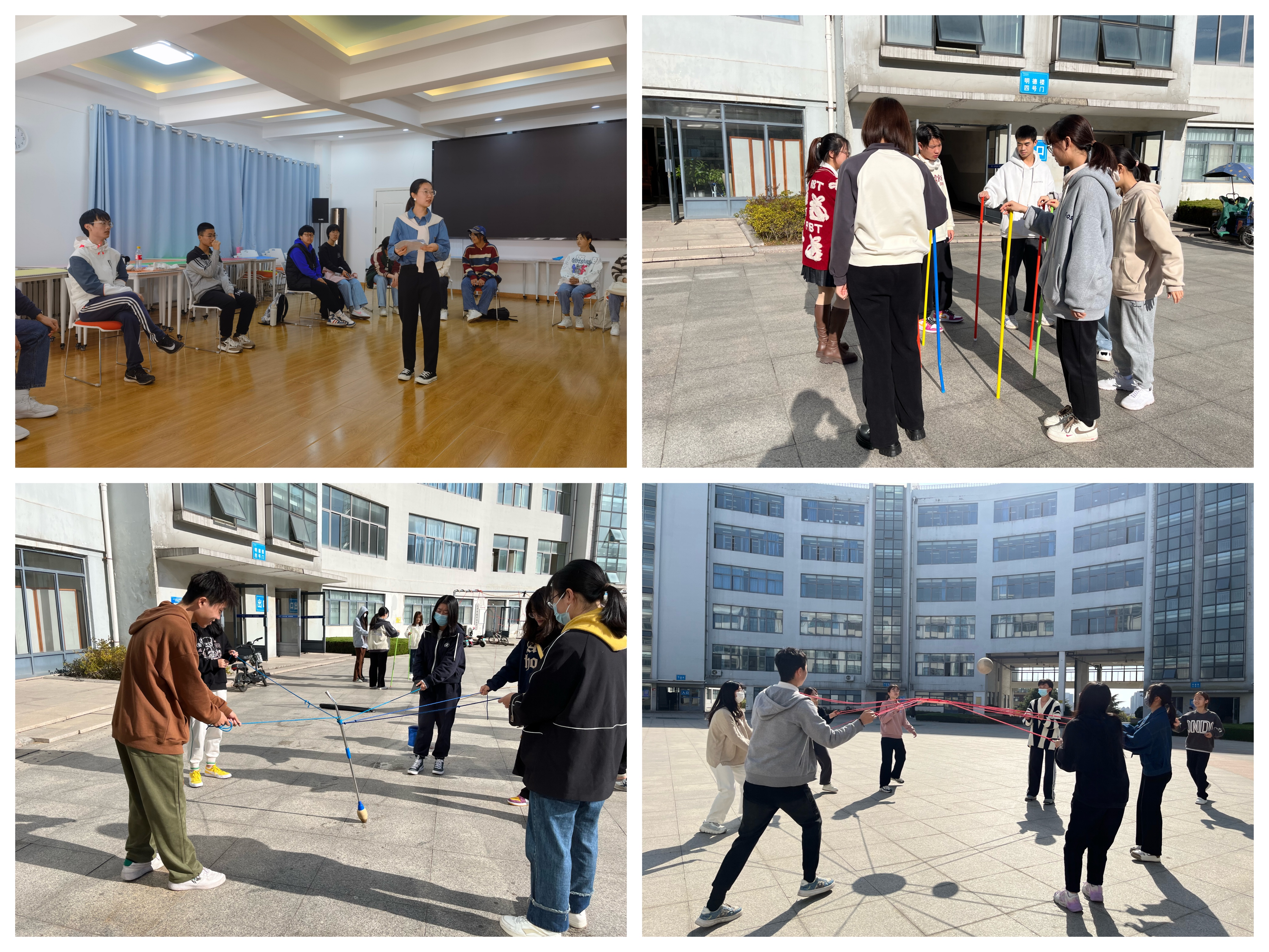 随后,辅导员带领班级同学分组进行“不倒森林”、“穿越电网”、“神笔马良”、“击鼓颠球”、“实践话收获”等环节,同学们在活动中从陌生到熟悉,从个体到集体,齐心协力体验了各个项目,游戏活动进展过程中,全体同学全心投入、遵守规则,互帮互助、团结协作。在自由交流分享阶段,大家用新的视角看自己和班级,结合活动体验畅所欲言。同学们纷纷表示,此次团辅活动提高了自身取长补短、团结协作、完成共同目标的能力,并能培养不怕挫折、不断进取、争创佳绩的意识。