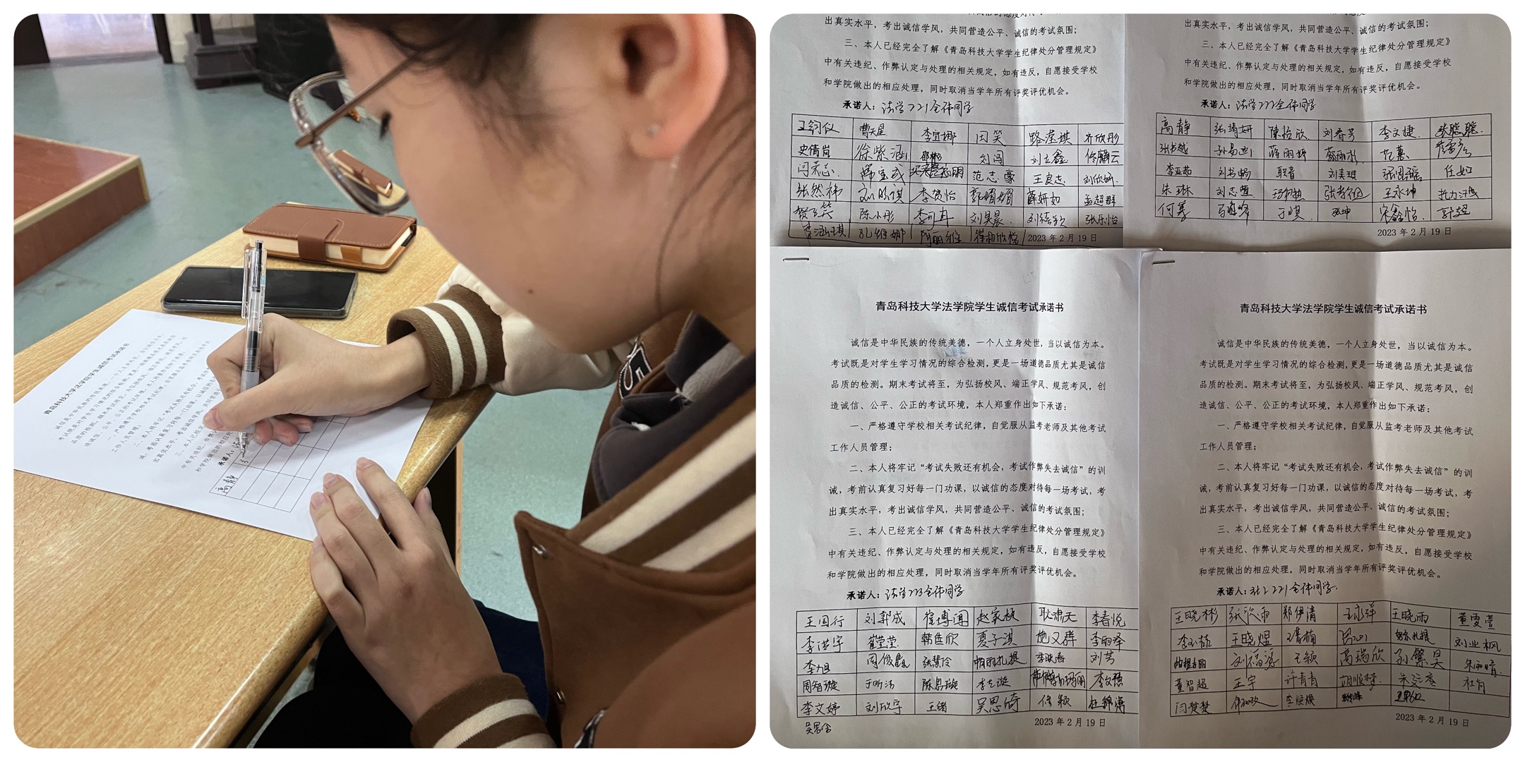 针对诚信考试,学院制作并发放《9999js金沙老品牌诚信考试承诺书》,参会的学生干部纷纷表态要做好模范带头作用,带头签订承诺书,表达了诚信应考的决心。