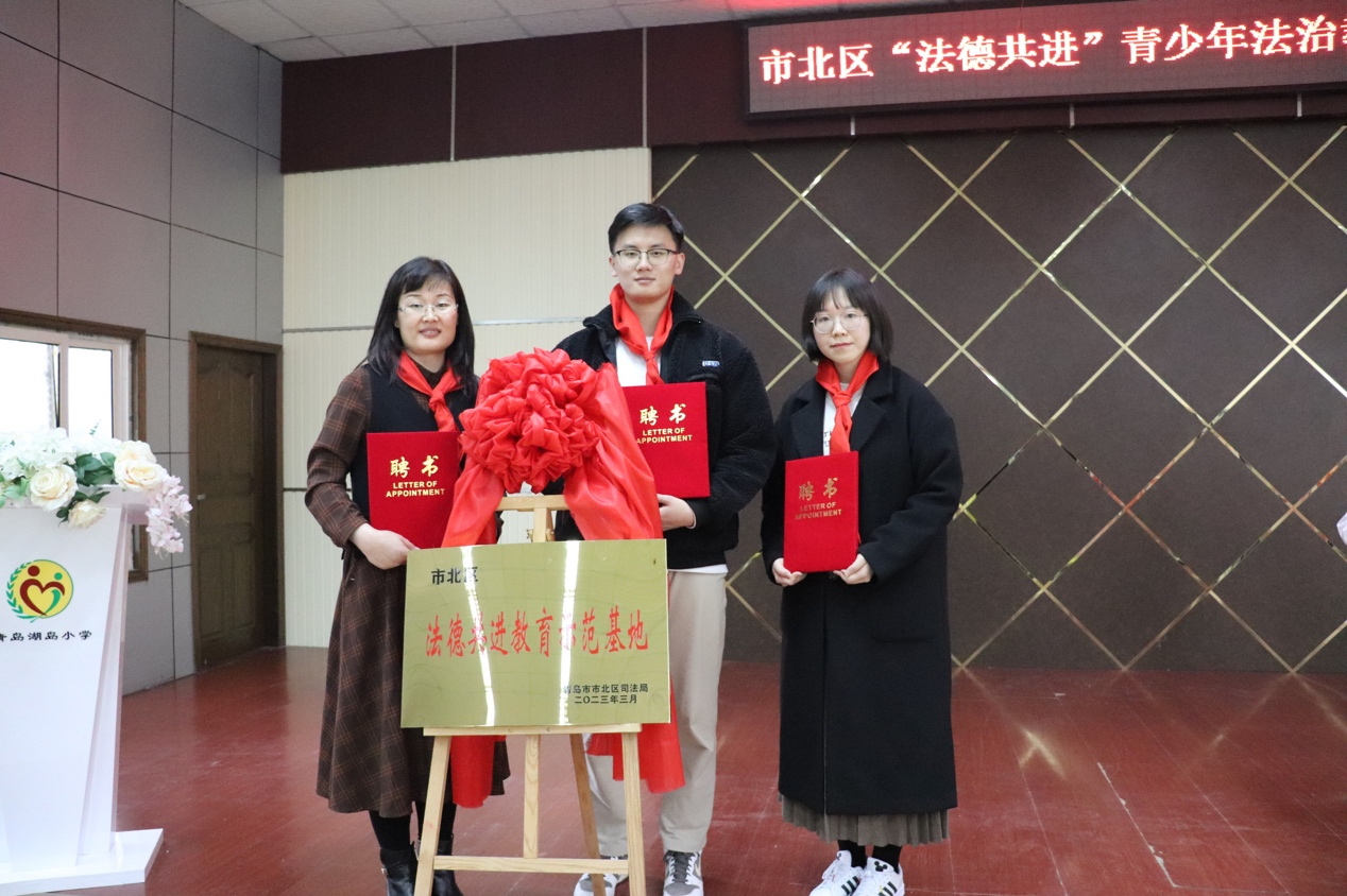 随后,青岛湖岛小学作为市北区“法德共进”教育示范基地正式揭牌,并由出席仪式的领导、嘉宾向“法德共进”教育示范基地辅导教师陈建云、蔺兮浠、李思达、张启鹏、于晓飞颁发了聘书。