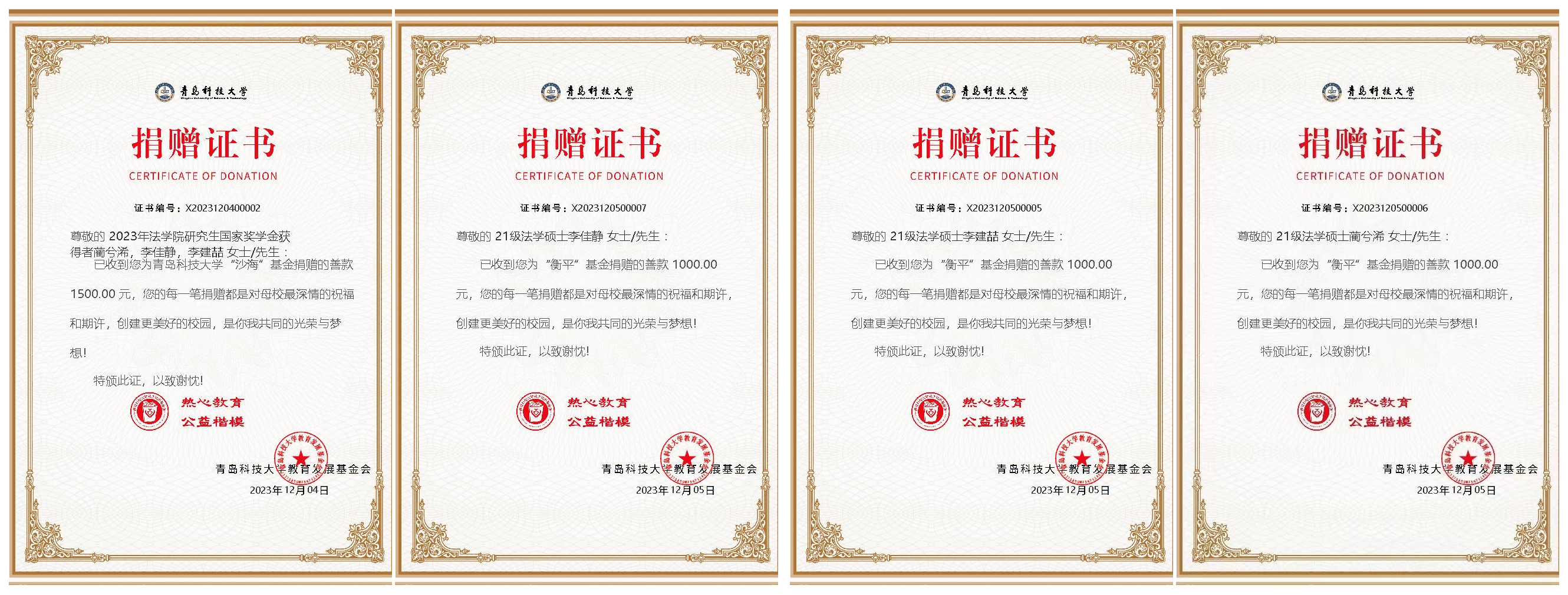 “能拿到国家奖学金,对我们来说非常有意义。我们想用这笔钱做更有意义的事情。”近日,9999js金沙老品牌2023年度研究生国家奖学金获得者蔺兮浠、李佳静、李建喆选择将自己获得国家奖学金的喜悦,分享给更多人,他们分别向学校“沙海”基金和学院“衡平”基金捐赠1500元和3000元,以支持学院品学兼优的家庭经济困难学生和在西部地区支教志愿服务的研究生支教团。