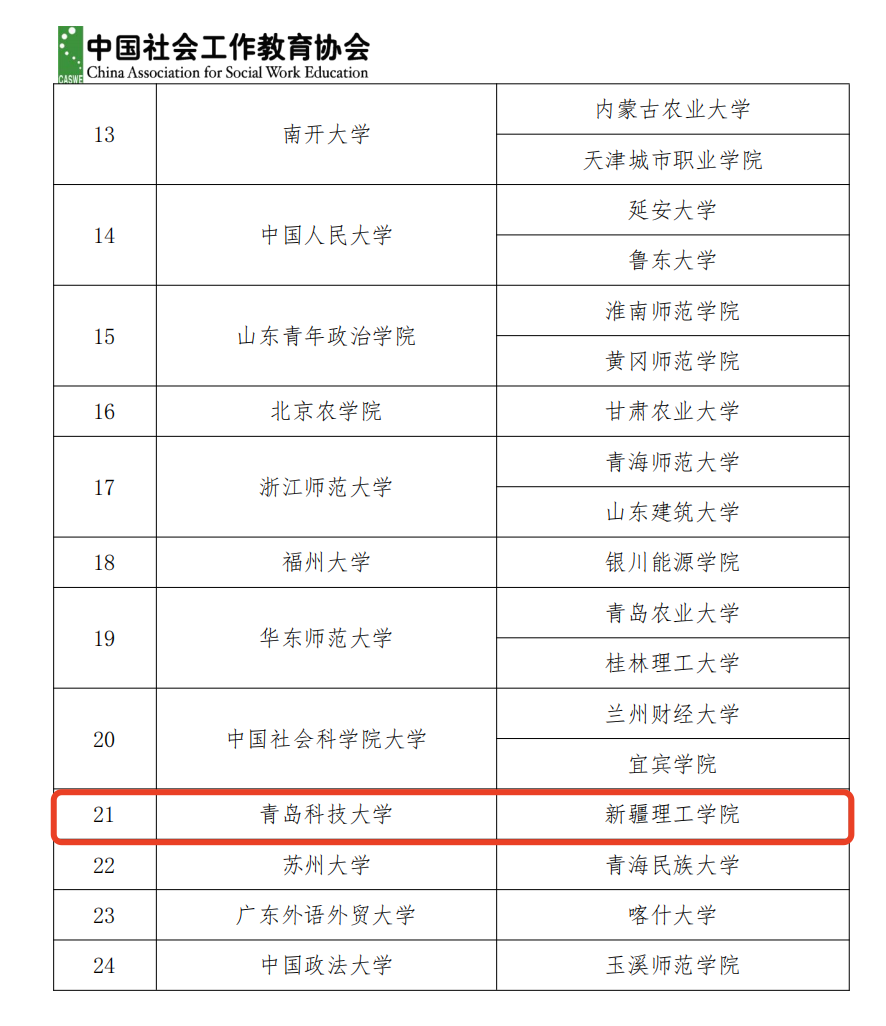 4月30日,中国社会工作教育协会公布了第一批“伙伴社工高校”名单,青岛科技大学正式入选并与新疆理工学院建立伙伴关系。