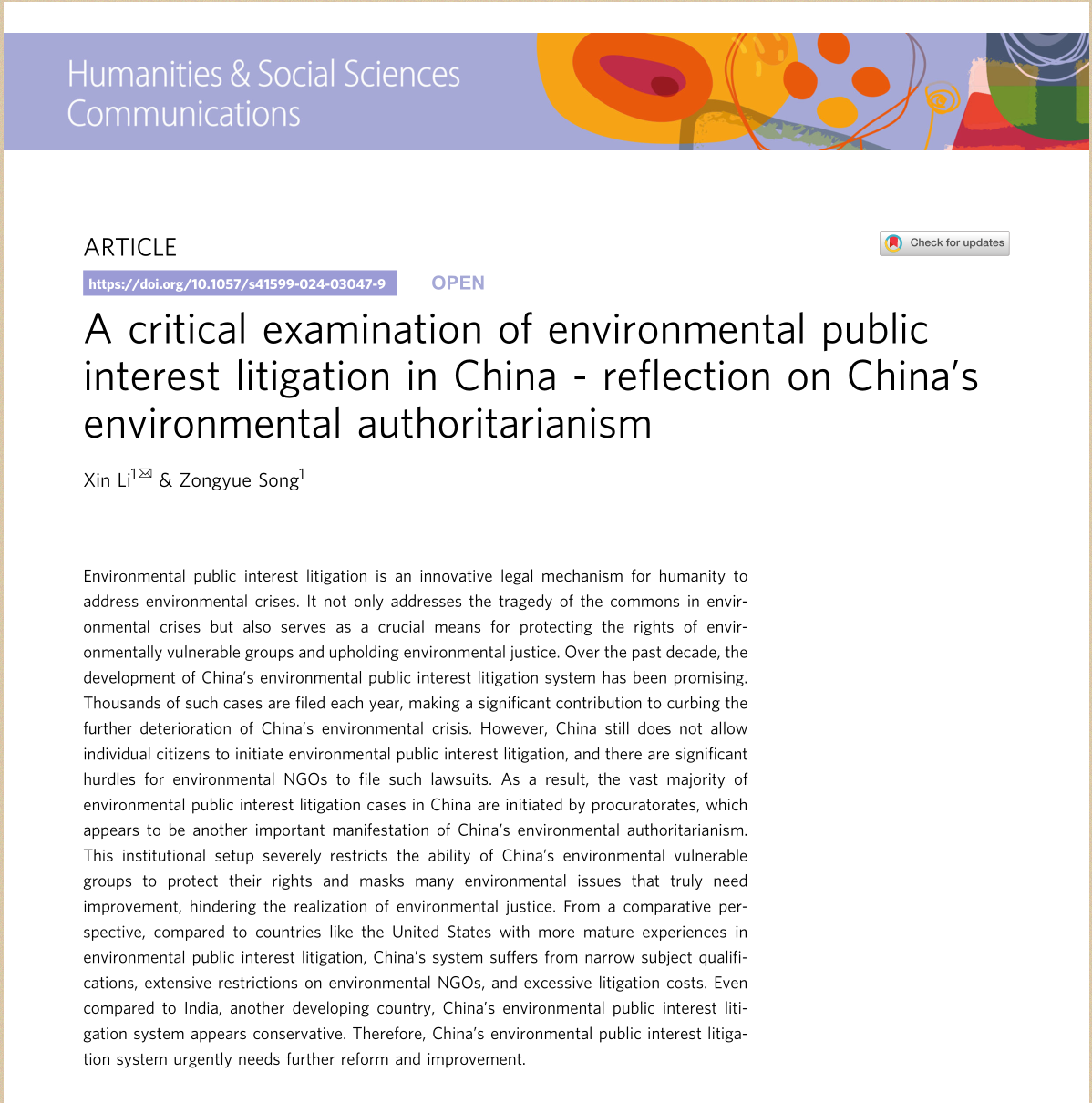 9999js金沙老品牌李鑫教授团队在Humanities & Social Sciences Communications期刊2024年5月发表学术论文“A critical examination of environmental public interest litigation in China - reflection on China’s environmental authoritarianism”。该论文的第一作者及通讯作者为李鑫教授,第二作者为李鑫教授指导的硕士研究生宋宗越。Humanities & Social Sciences Communications(《人文与社会科学通讯》)为Social Sciences Citation Index(SSCI)以及Arts& Humanities Citation Index(A&HCI)两个权威数据库源刊,致力于人文科学、社会与行为科学所有领域的高水平研究,具有良好的全球影响力。Humanities & Social Sciences Communications(《人文与社会科学通讯》)位于国际JCR分区一区,中国科学院期刊分区社会学大类二区。