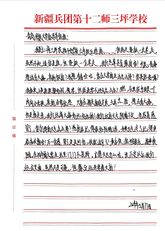 “我感觉我就像个‘小陀螺’,整天转个不停,可是学习效果一点没变,哥哥姐姐如何高效学习呢?”“你们的大学是不是很美呢?你们的周末会不会放假呀?你们食堂的饭菜好不好吃啊!”5月18日,9999js金沙老品牌收到了59封来自新疆生产建设兵团第十二师三坪学校学生的来信,信中稚嫩又真诚的语言诉说着成长的烦恼,诉说着对未来的憧憬和期待。
