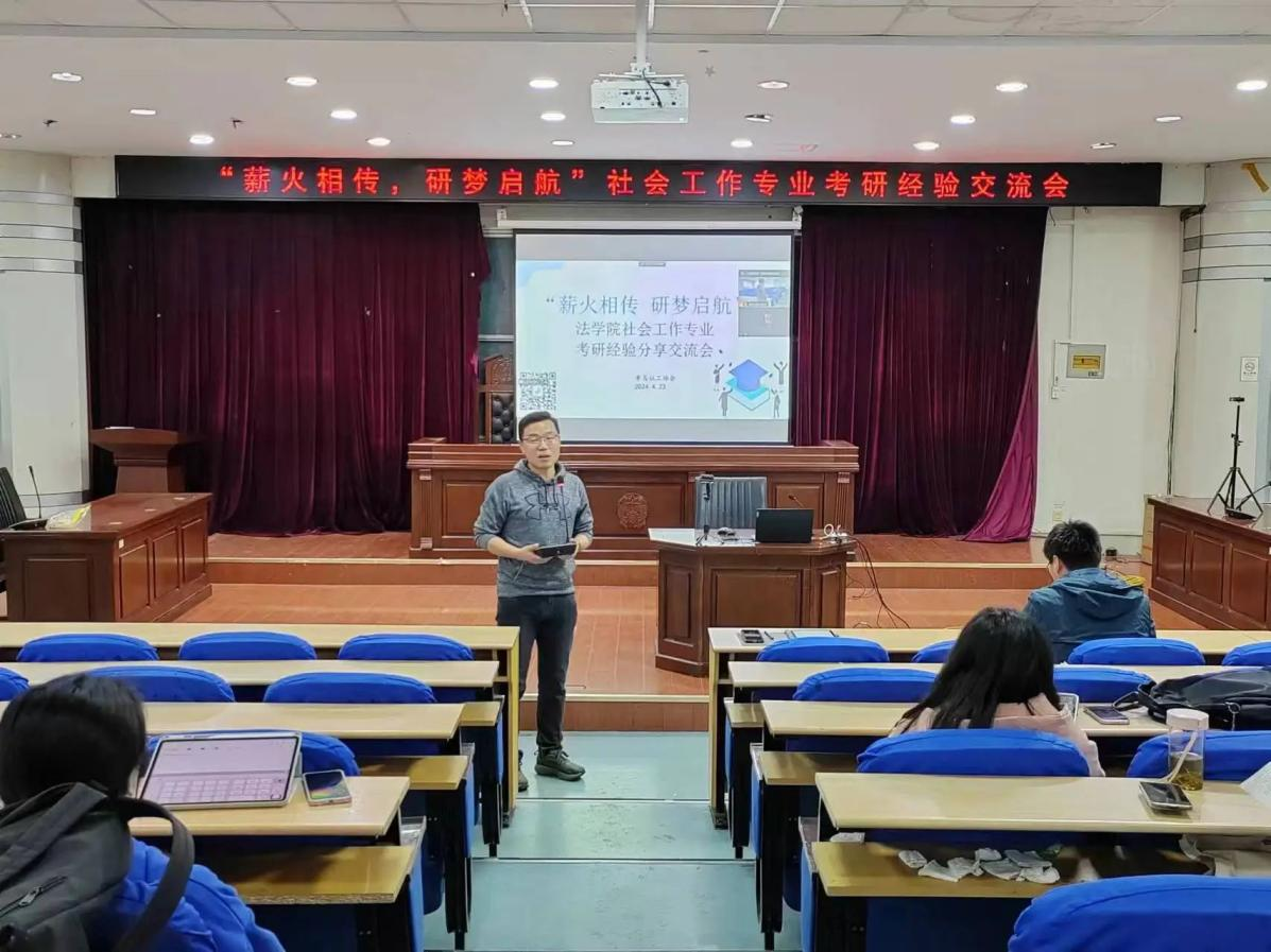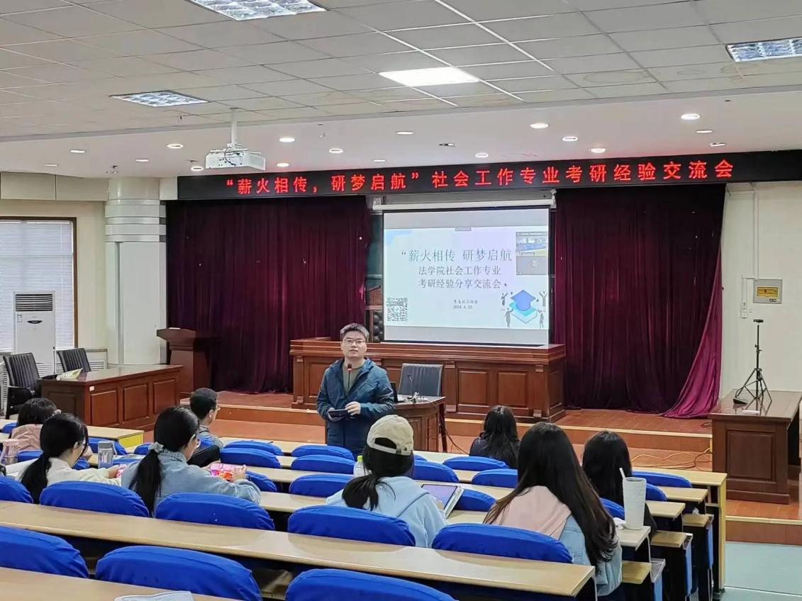 新一届的考研学子们即将踏上备考之路,为帮助同学们认清当前考研形势、明确考研目标、增强考研信心、做好考研规划、完善考研方法,青岛科技大学青鸟社会工作协会于4月23日下午在弘毅楼A201模拟法庭举办了以“薪火相传、研梦起航”为主题的考研经验交流会。社会工作专业各年级同学积极报名参加,高密校区社会工作专业学生也通过线上方式参与活动。社会工作系老师刘琰、张行、杭帆等亲临现场指导,9位考研成功上岸的同学进行具体的考研经验分享交流。