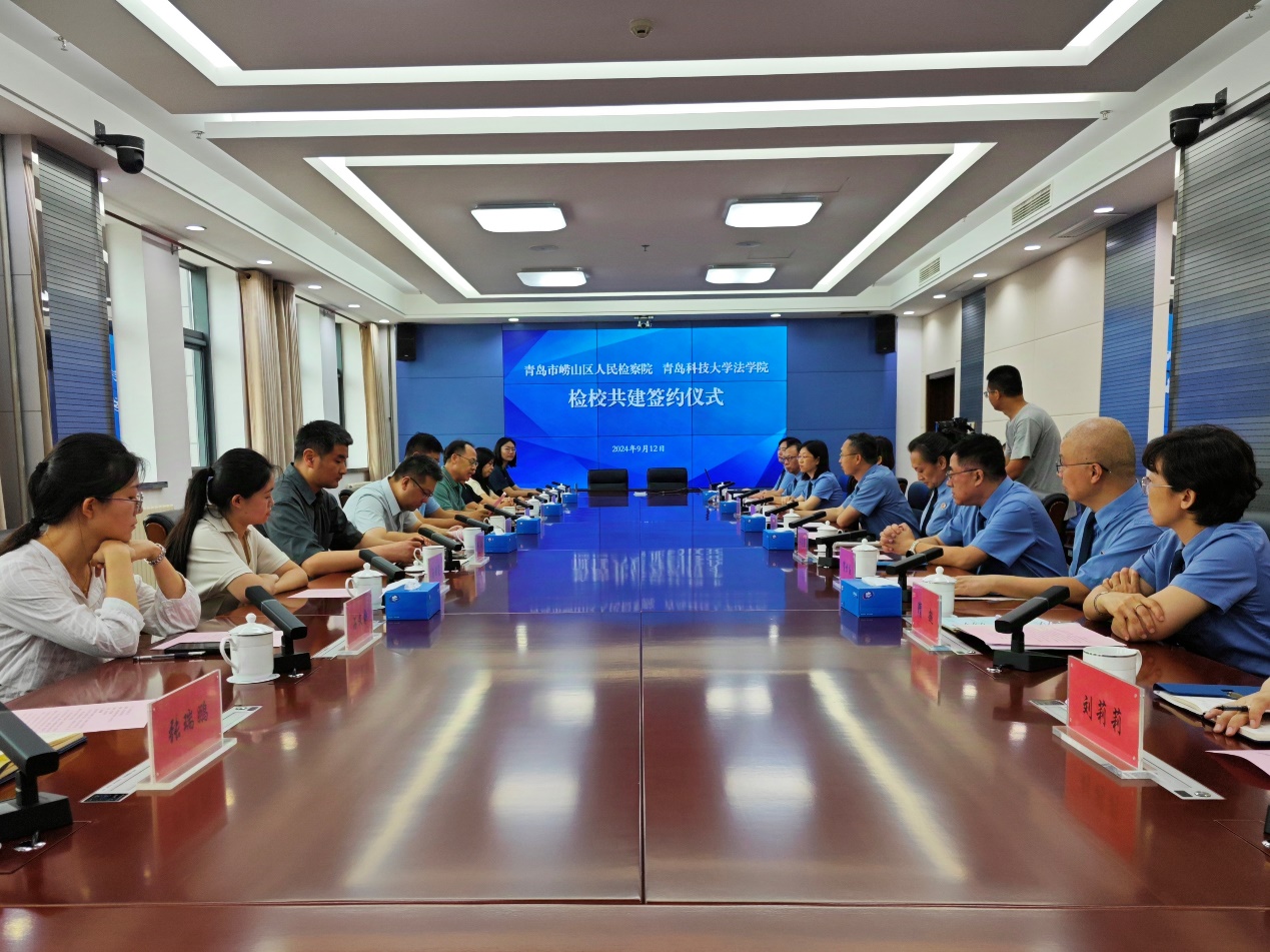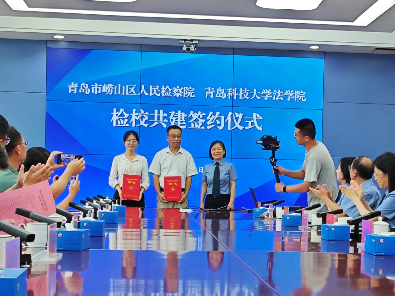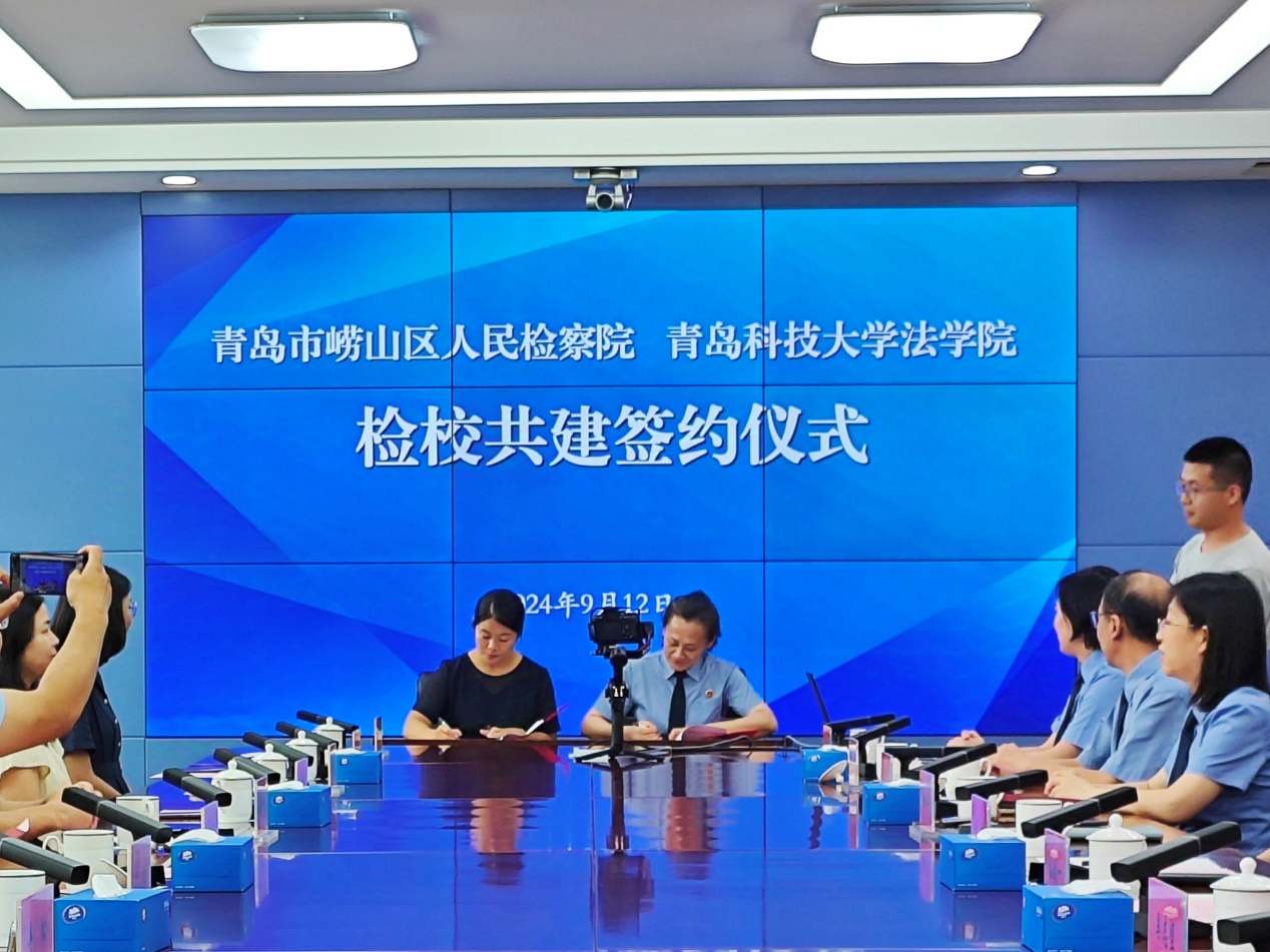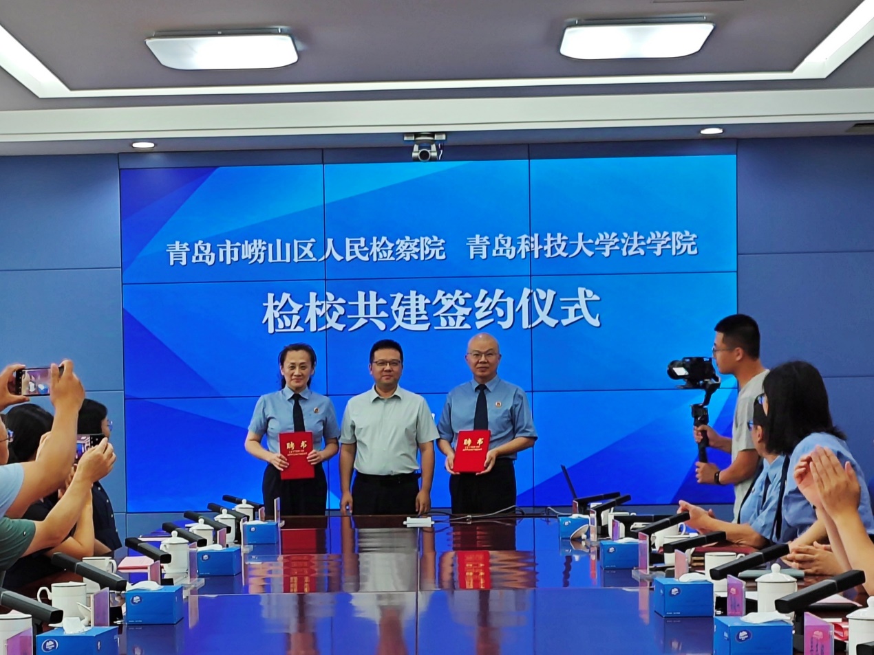 会上,双方签署了共建协议,并举行了“青岛科技大学法学专业科研实践教学基地”和“青岛市崂山区人民检察院检察理论研究基地”揭牌仪式。