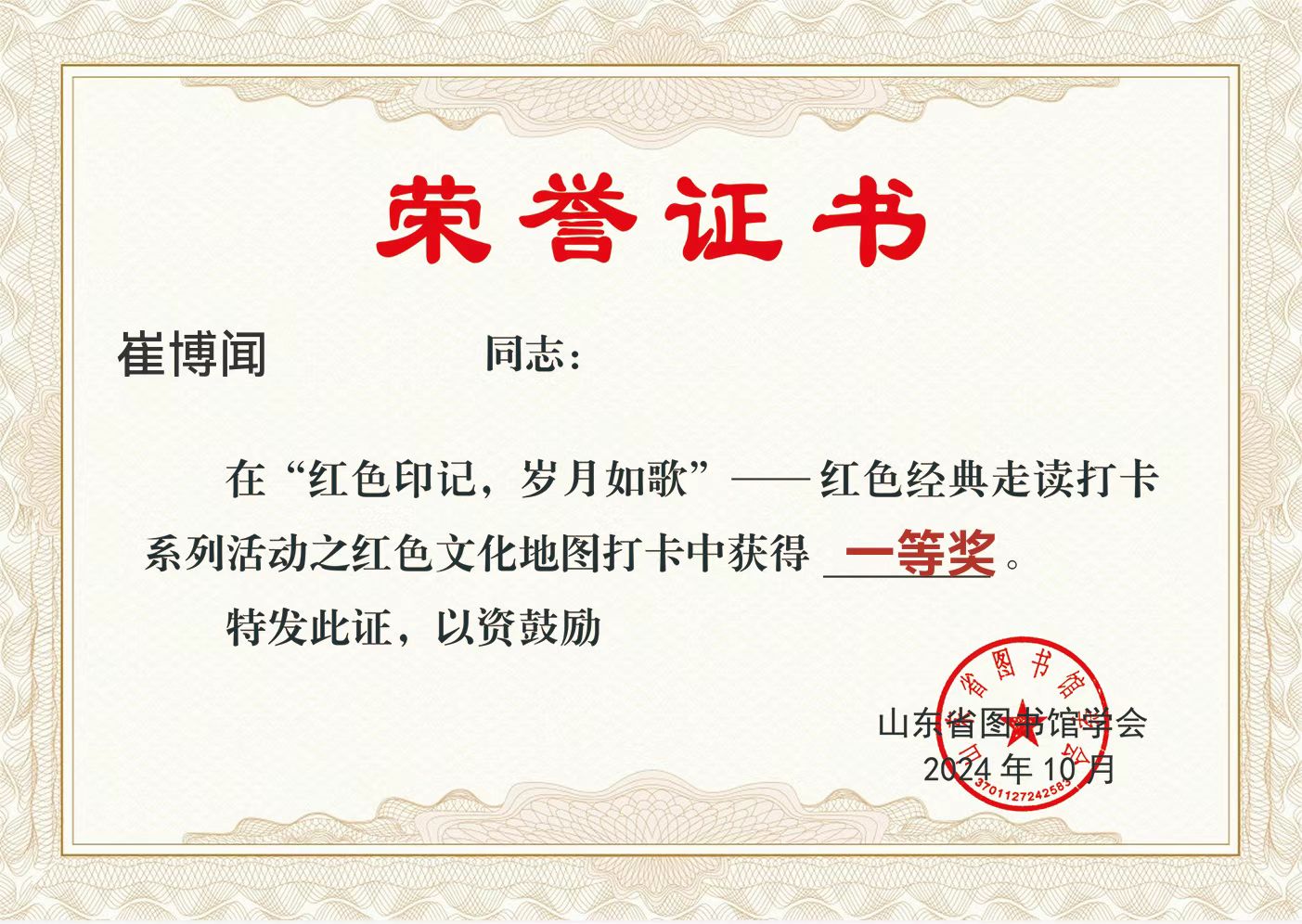 近日,山东省图书馆学会组织开展的“红色印记,岁月如歌”——红色经典走读打卡系列活动获奖名单揭晓,法学223班崔博闻获得“红色文化地图打卡”板块一等奖(全市唯一)。
