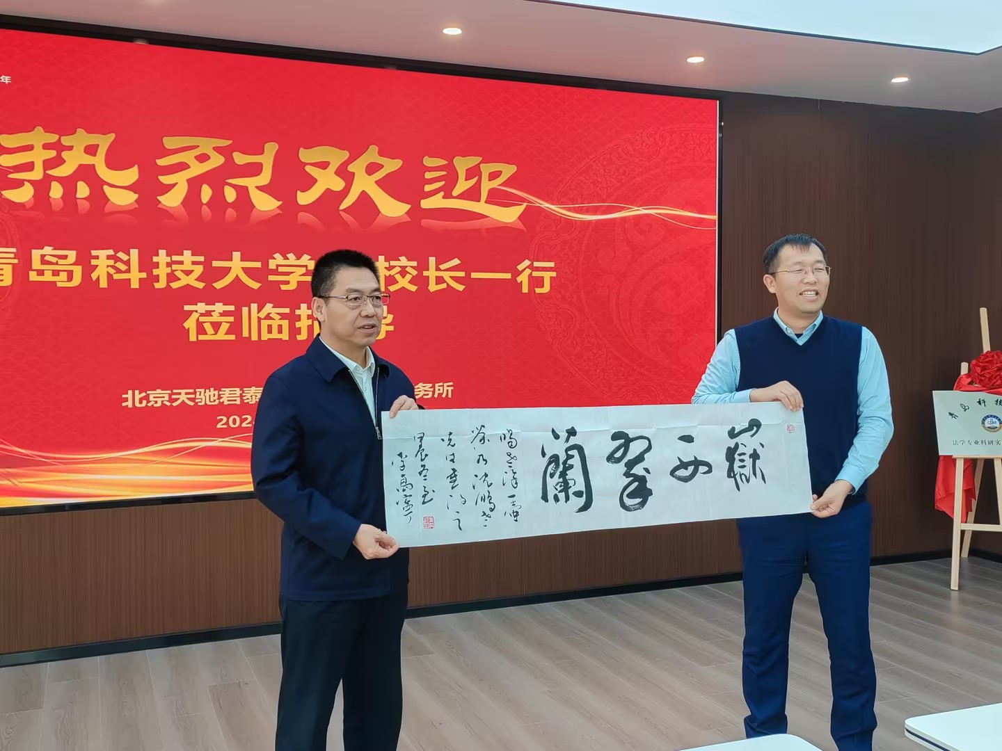 曲明与张文波共同为青岛科技大学法学专业科研实践教学基地揭牌,吕万翔向张文波校友赠送书法作品《岳西翠兰》,祝贺北京天驰君泰(杭州)律师事务所事业蒸蒸日上。
