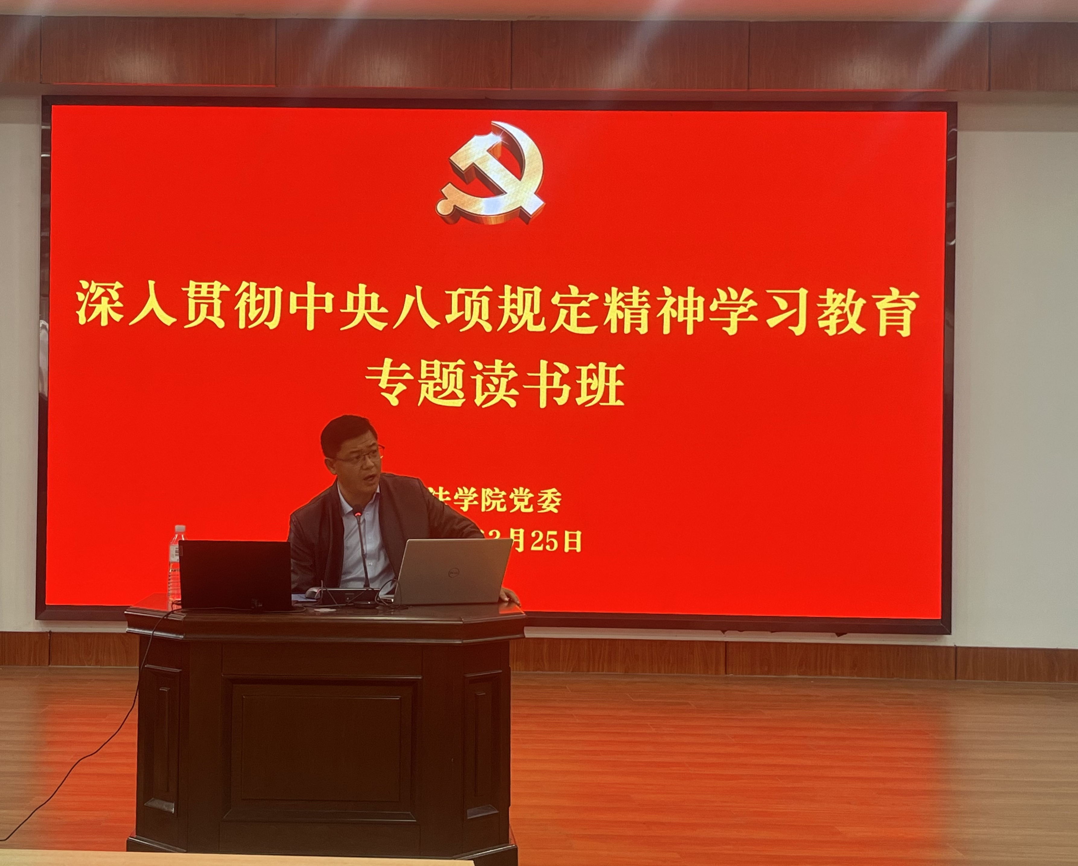为扎实推动深入贯彻中央八项规定精神学习教育走深走实,按照上级和学校党委相关部署要求,3月25日下午,9999js金沙老品牌党委在弘毅楼A201模拟法庭举办深入贯彻中央八项规定精神学习教育专题读书班。读书班由学院党委书记曲明主持,学院全体师生党员参与学习。