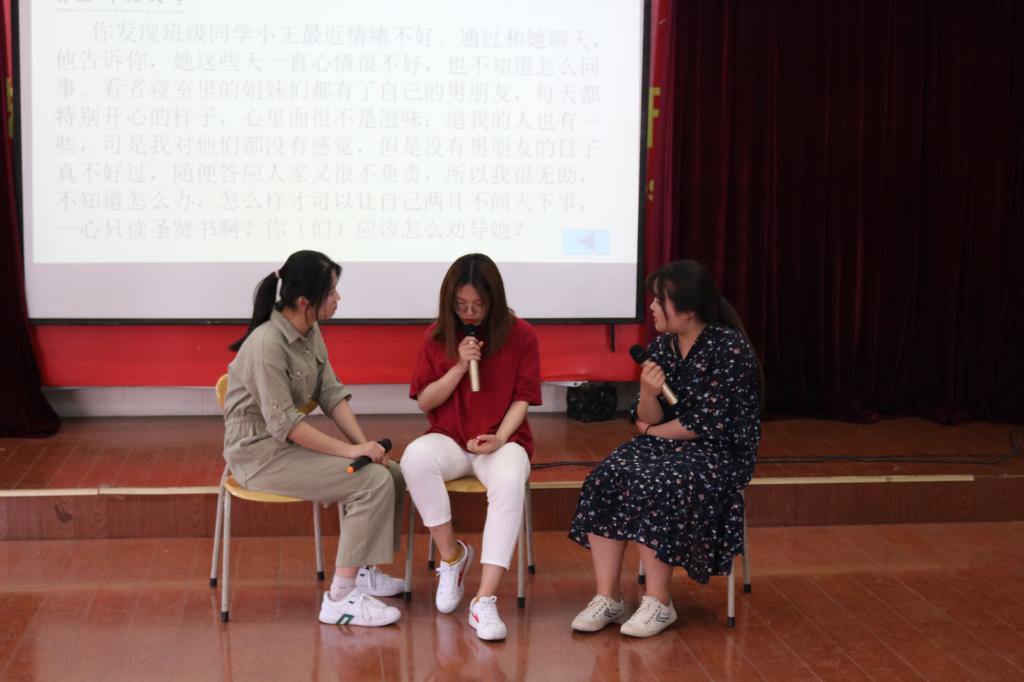 决赛分为情景剧表演和朋辈辅导展示两个环节。情景剧表演环节要求每支队伍的三名选手分饰不同角色,根据前期提供的心理冲突情境进行续演,通过表演充分反映角色内心情绪,展现如何通过朋辈互助达到心理协调的过程。朋辈辅导展示环节要求参赛队伍根据现场抽取的案例题目,分析案例反应的实际问题,运用朋辈心理辅导知识和技能对出现的问题进行解决。两个环节的比赛充分考验了参赛队员的专业素养、分析理解和临场应对等多方面能力。11支参赛队伍对各自的心理困境案例进行了快速分析、冷静处置,用扎实的朋辈心理辅导技能赢得了现场师生的阵阵掌声。